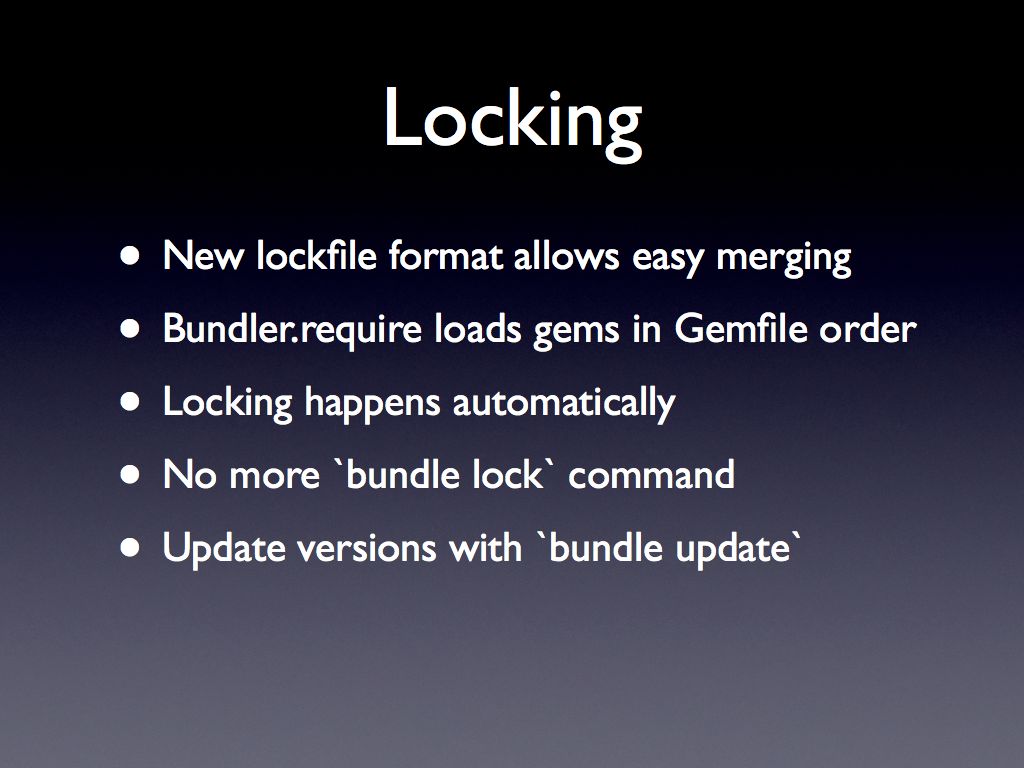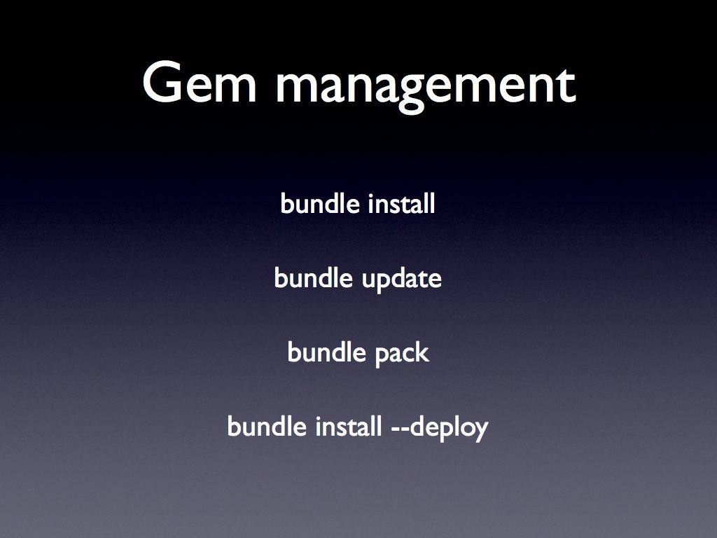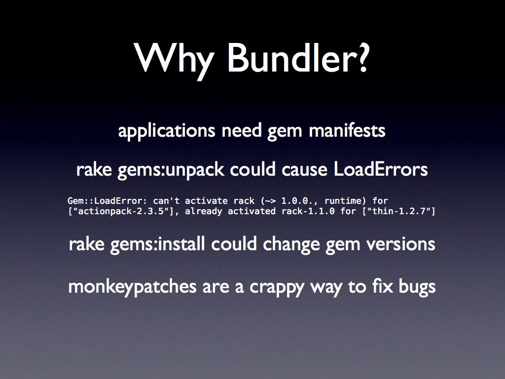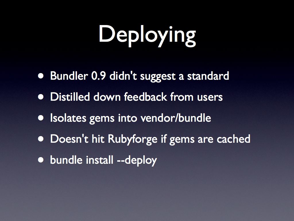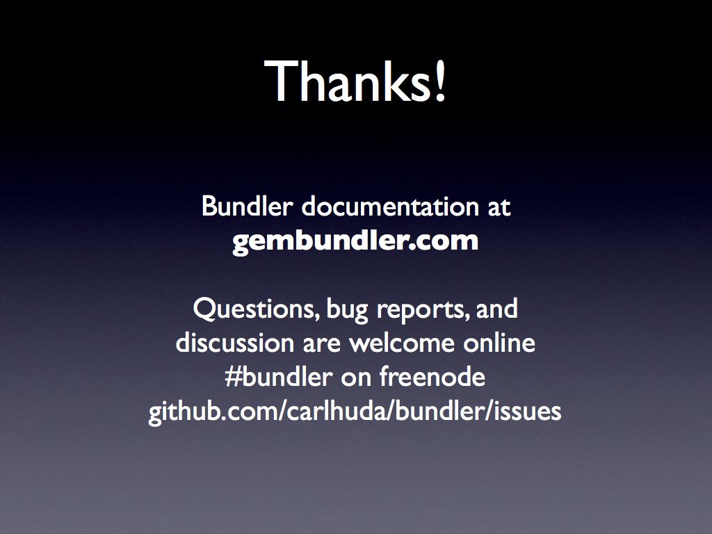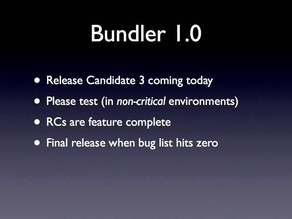 These are the slides for the Bundler webinar I gave at Engine Yard, right before the release of Bundler 1.0rc3.