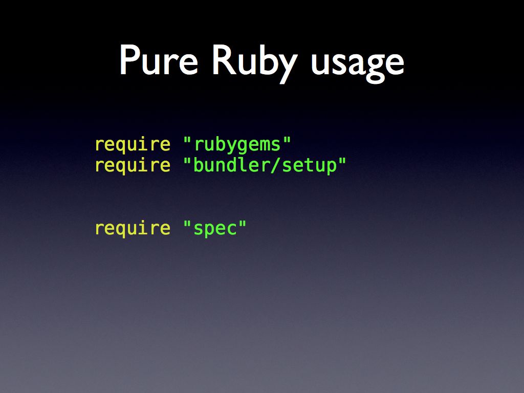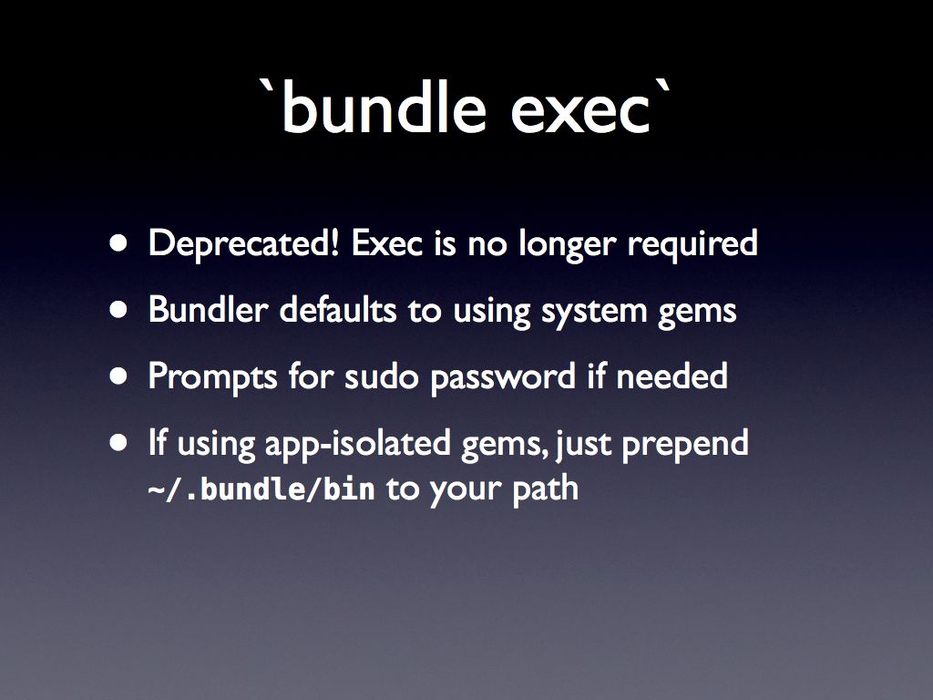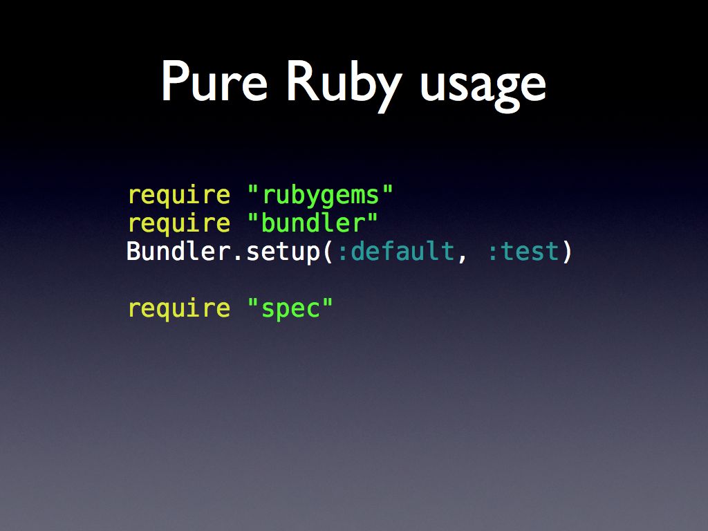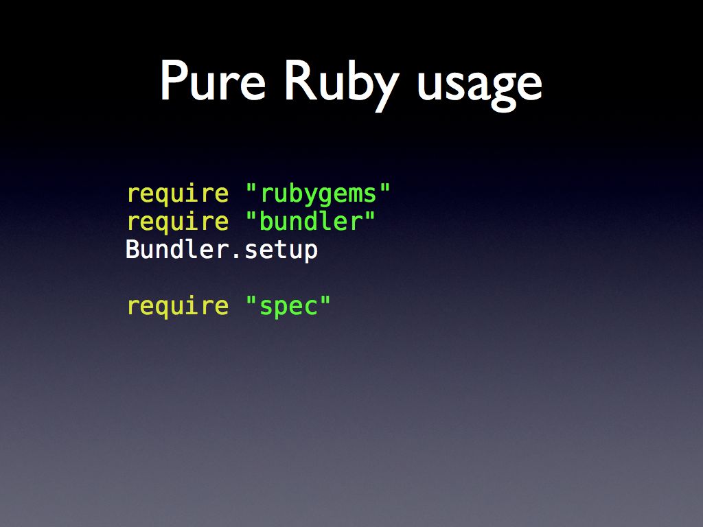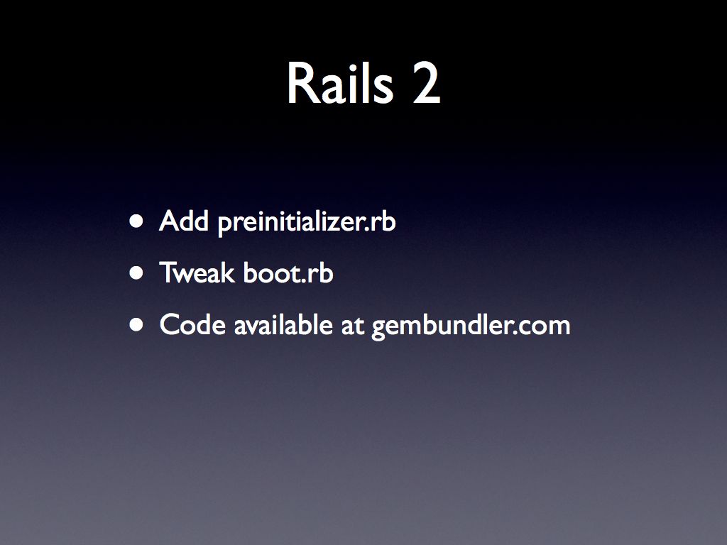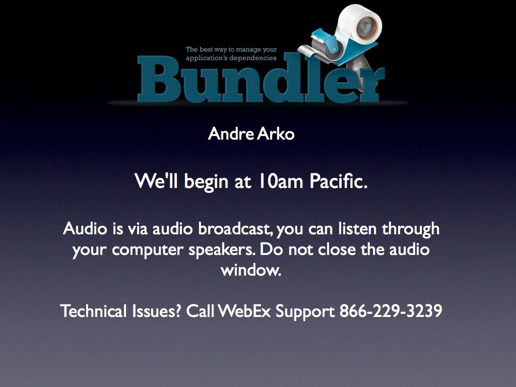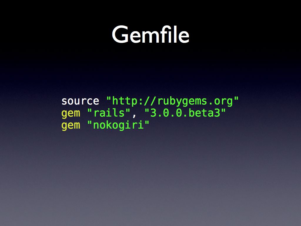 These are the slides for the Bundler webinar I gave at Engine Yard, right before the release of Bundler 1.0rc3.