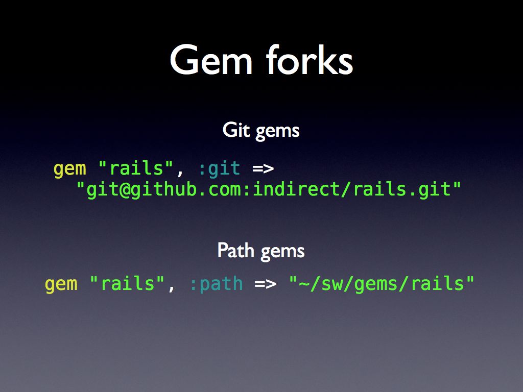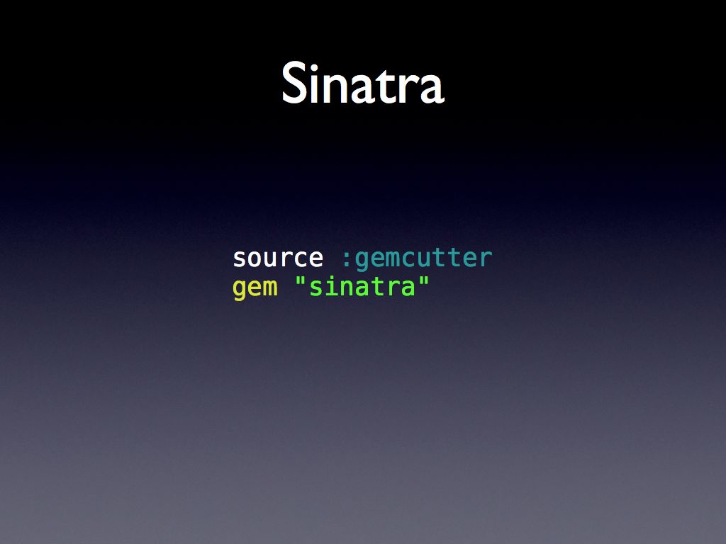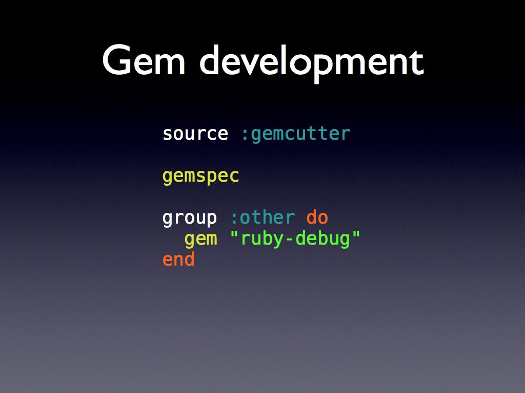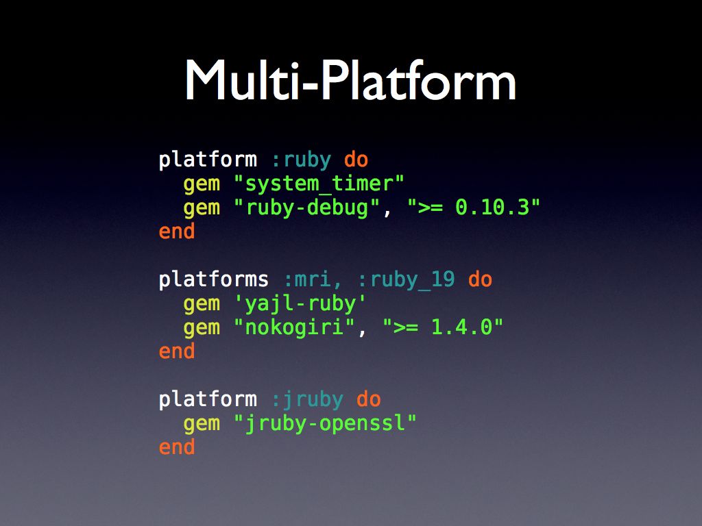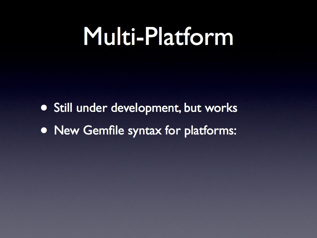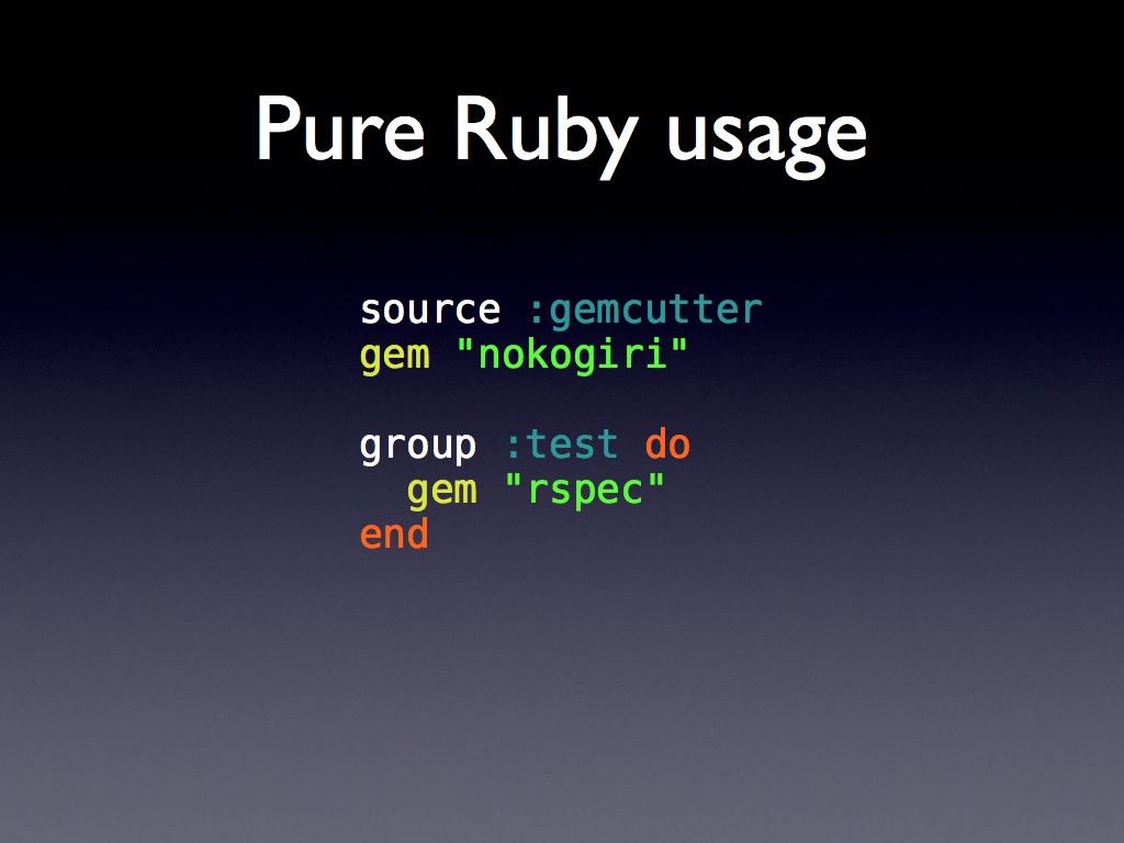 These are the slides for the Bundler webinar I gave at Engine Yard, right before the release of Bundler 1.0rc3.