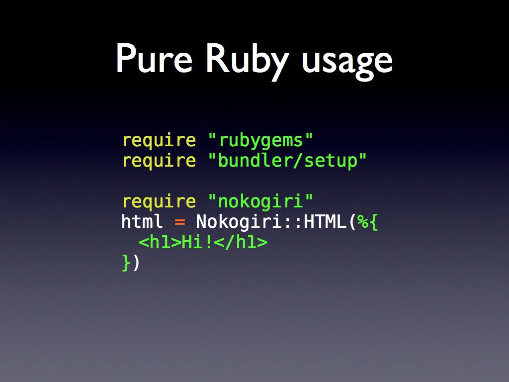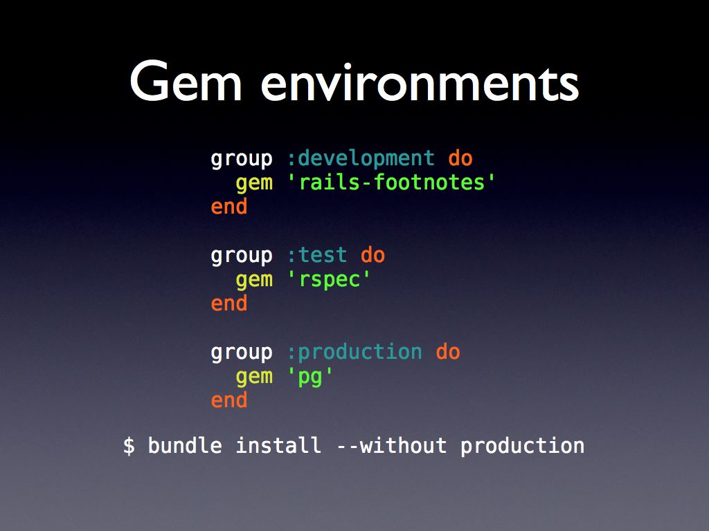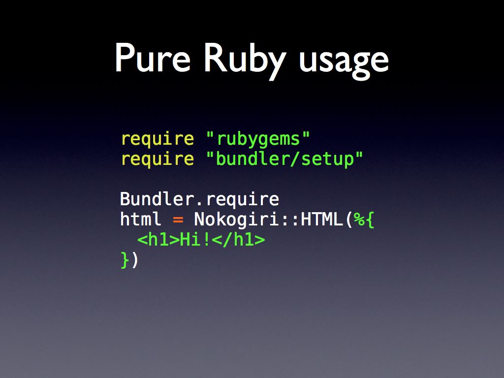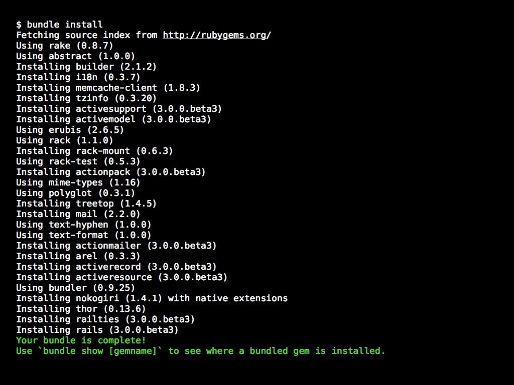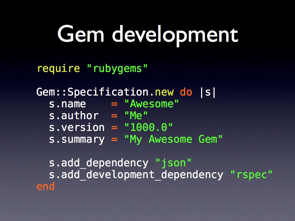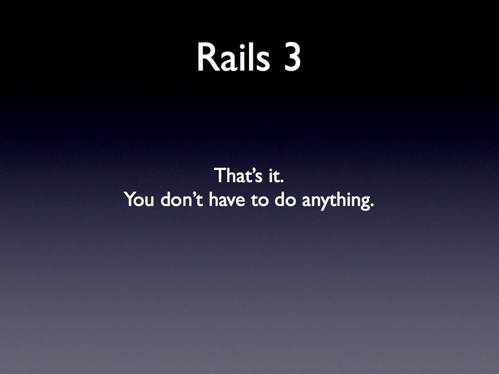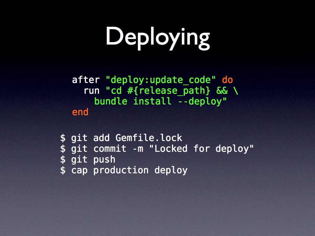 These are the slides for the Bundler webinar I gave at Engine Yard, right before the release of Bundler 1.0rc3.